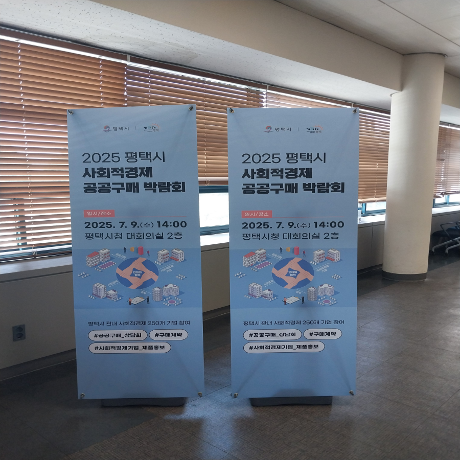 ○ 사업명 : 2025 평택시 사회적경제 공공구매 박람회 ○ 일 시 : 2025. 7. 9.(수) 14:00~17:00 ○ 장 소 : 평택시청 대회의실(2층) (평택시 경기대로 245) ○ 행사내용 : 관내 사회적경제 기업과 공공기관 간 우선구매 상담 및 성사 추진 1. 상담관 운영 : 평택시는 11개 기관 2. 홍보관 운영 : 관내 사회적경제 기업(11개 기업) ○ 참여기관 : 1. (상담관) 평택시(배다리도서관), 평택지방해양수산청,고용노동부,한국토지주택공사,국민연금공단,국민건강보험공단,평택도시공사,(재)평택산업진흥원,(재)평택시문화재단,(재)평택복지재단,(재)평택시청소년재단 2. (홍보관) (사복)함께하는세상 삼우보호작업장,(사)우리들행복나눔,㈜온정f&b,(주)삼화기획,㈜크래프터,사회적협동조합 꿈나무,5em기획연구소 사협,사협 어린이안전협회,엠제이엠㈜,(주)알액션,(주)도트 ○ 운영시간 : 1. 14:00~17:00 : 11개 공공기관 상시 상담 2. 14:00 ~ : 평택시 본청 공무원 중심 상담 등 3. 15:00 ~ : 평택시 출장소, 사업소 등 공무원 중심 상담 4. 16:00~ : 평택시 읍면동 공무원 중심 상담 등 |