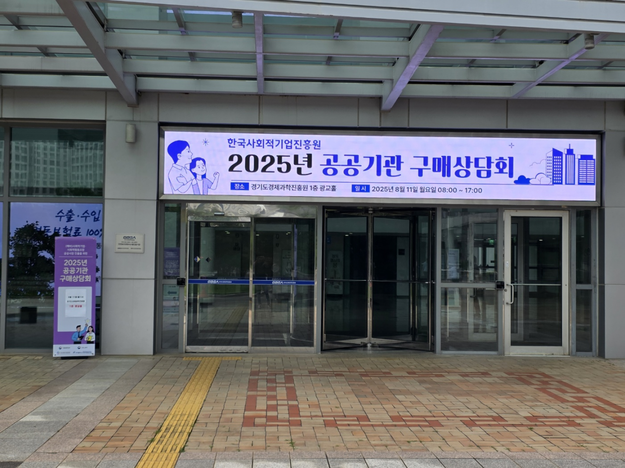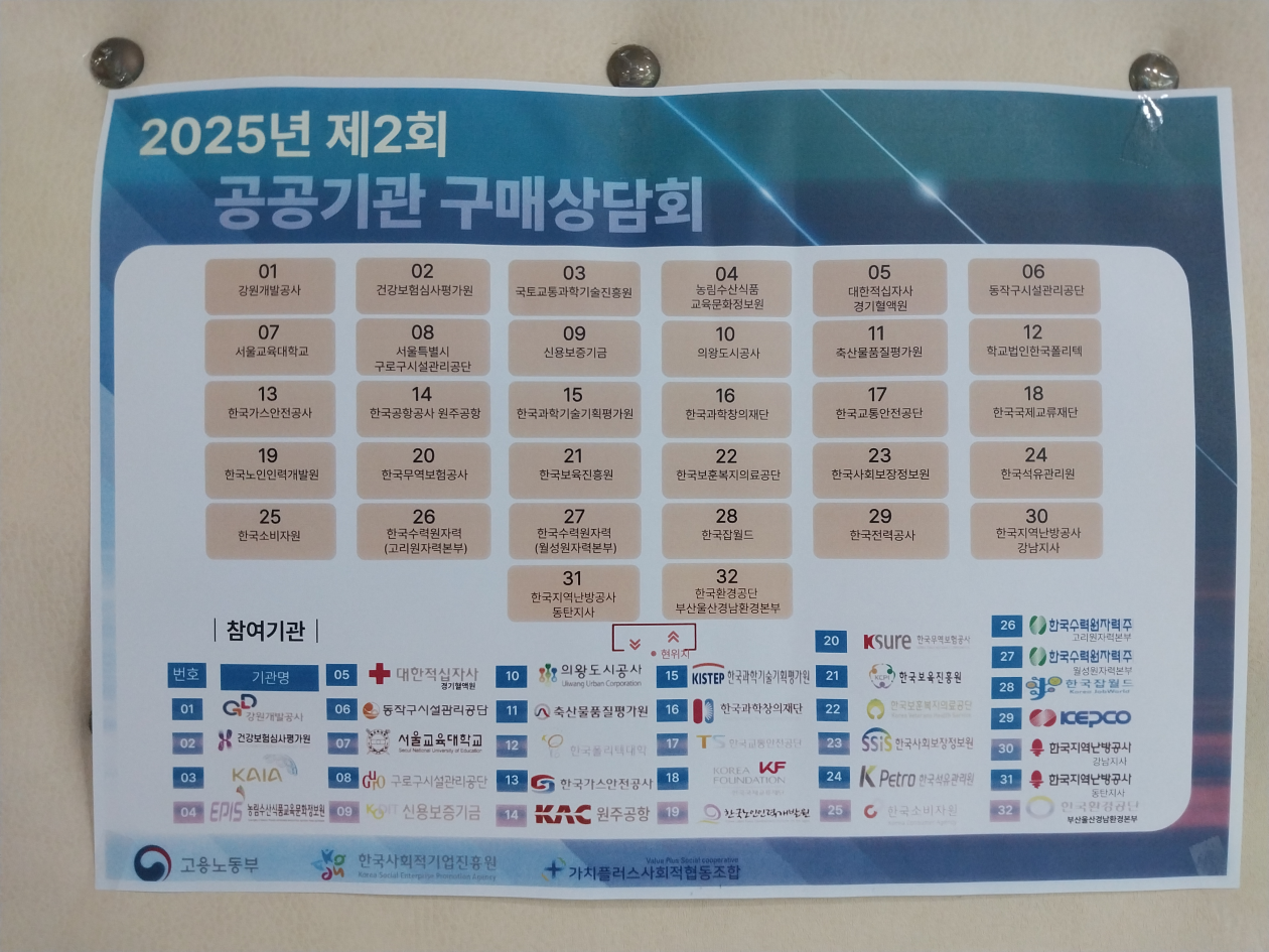 2025년 제2회 공공기관 구매 상담회 다녀왔습니다. 최고관리자 0 252 2025.08.13 19:13 2025년 8월 11일(월) 경기도과학진흥원 광교홀에서 (13:00~16:00) 가치플러스 사회적협동조합에서 진행하는 [2025년 제2회 공공기관 구매 상담회]에 32개의 공공기관이 참석하여5곳과 구매 상담회를 갖었습니다. 뜨거운 열기가 가득한 가운데서우리 시설을 알리는 일에 열과 성의를 다하였습니다.공공기관에서도 매우 긍정적으로 상담회를 진행 하여 보람있는 하루를마감하고 돌아왔습니다. 애쓴 만큼 좋은 성과를 기대해 봅니다.
